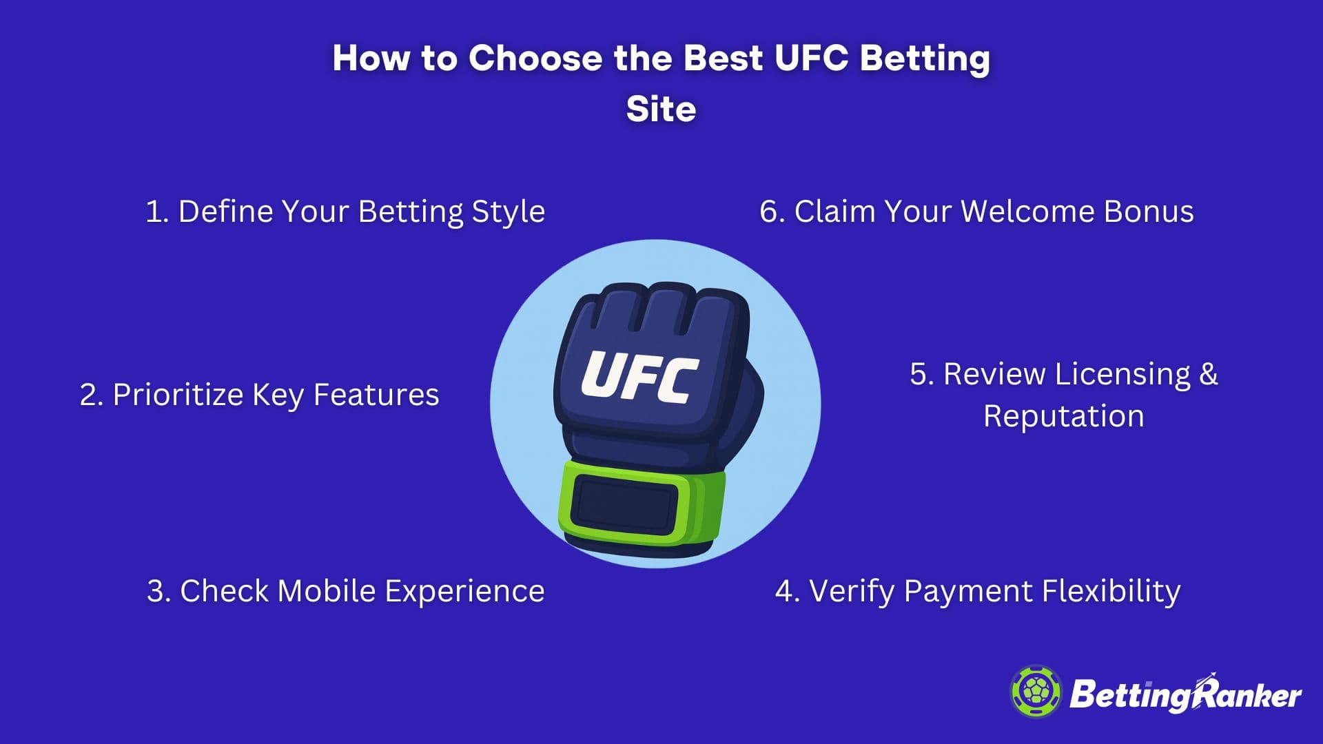 No existe un único sitio de apuestas de UFC que se adapte a todos. La mejor casa de apuestas deportivas para ti depende de cómo apuestas, qué características valoras y qué tan profundo quieres adentrarte en los mercados de UFC. Aquí tienes una guía rápida de 6 pasos para ayudarte a encontrar la plataforma adecuada para tu estilo de apuestas, utilizando solo casas de apuestas deportivas de confianza presentadas en BettingRanker.