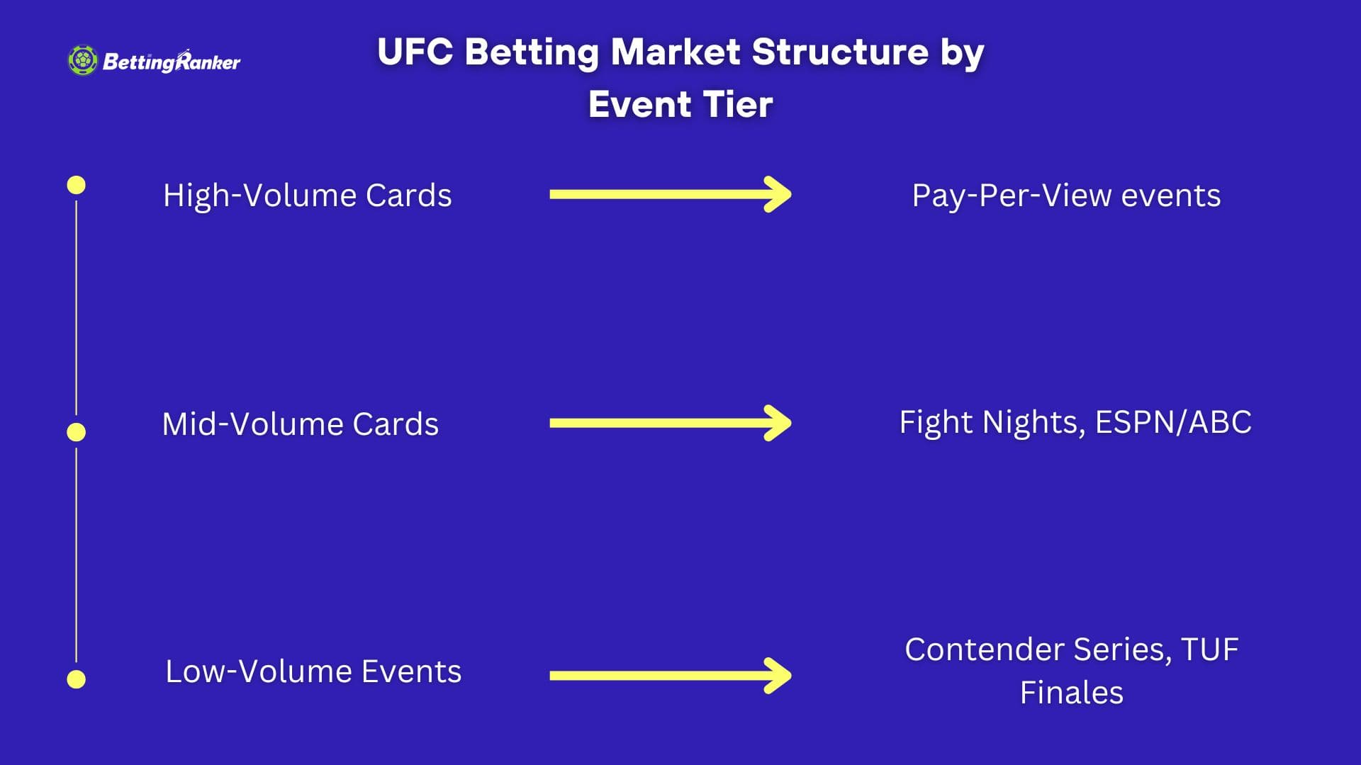 Comprender el mercado de apuestas de UFC significa saber cómo se comporta según el nivel del evento. Una pelea por el título en un "blockbuster" Pay-Per-View (PPV) no atrae el mismo tipo de volumen de apuestas, ni oportunidad de apuestas, que un discreto co-estelar en una tarjeta Fight Night. Los mercados cambian no solo por la habilidad del peleador, sino por la visibilidad, liquidez y momento del evento.